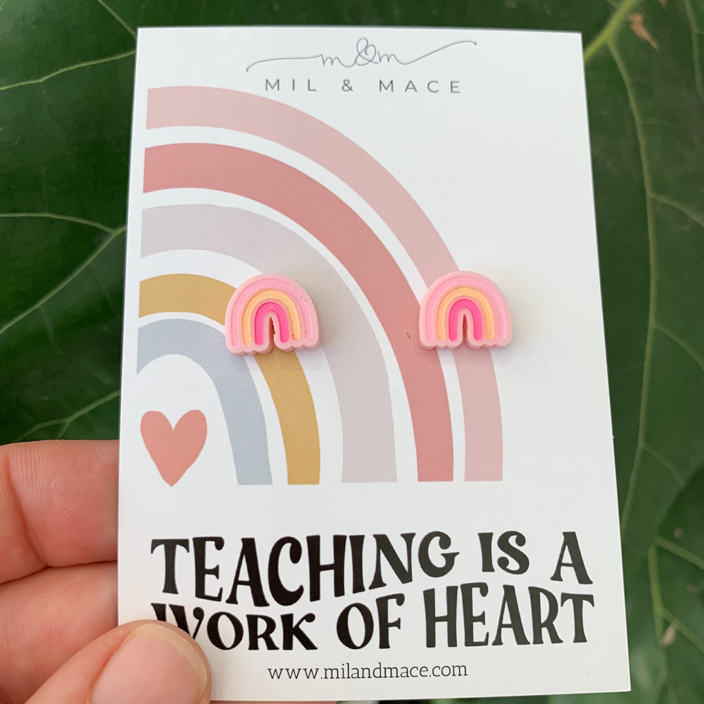 Educator Gift 'Teaching is a work of Heart' Rainbow Stud Earrings