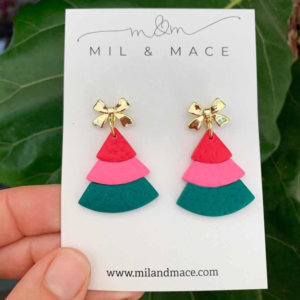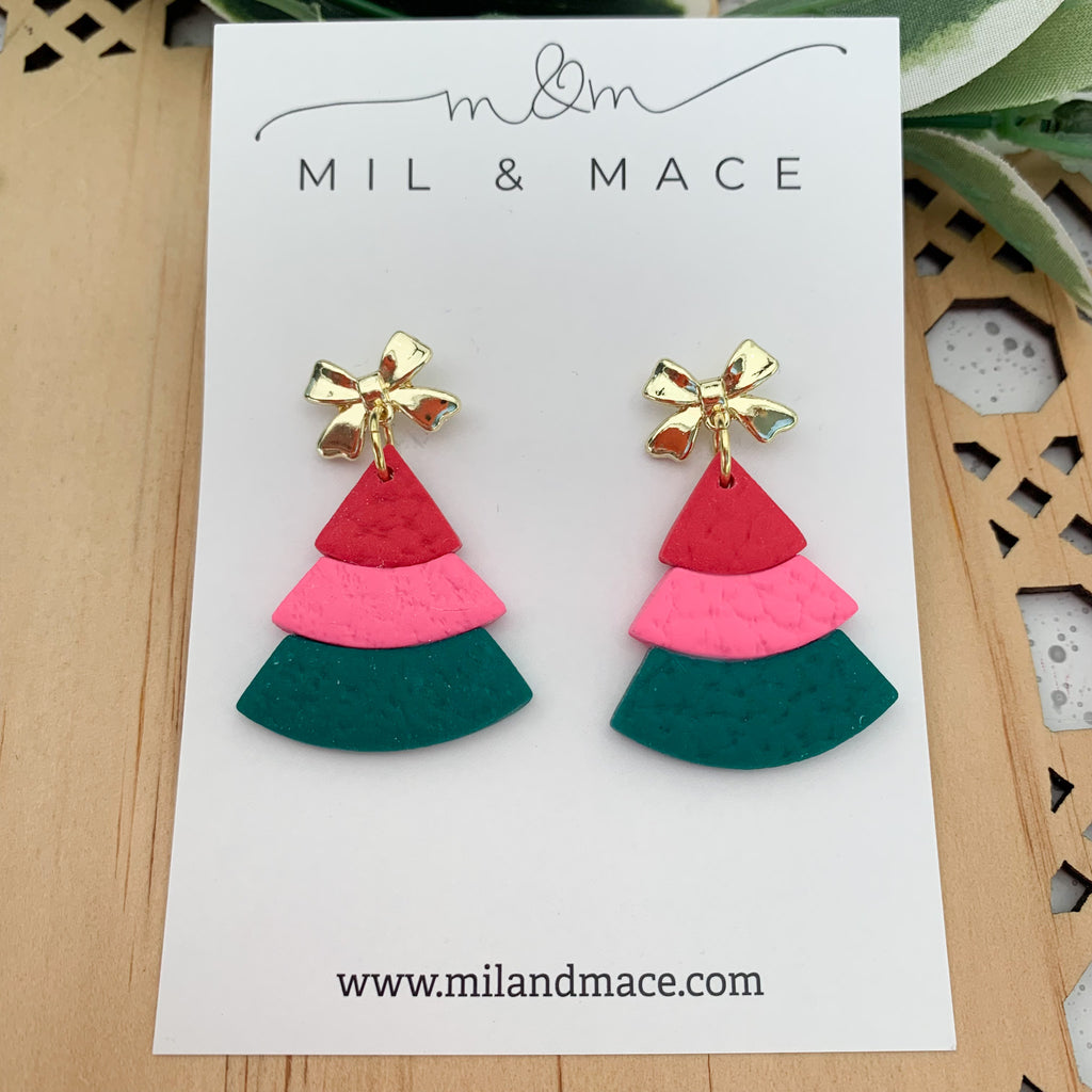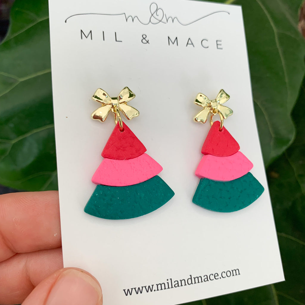 Layered Pink, Red and Green Christmas Trees Polymer Clay Dangle Earrings