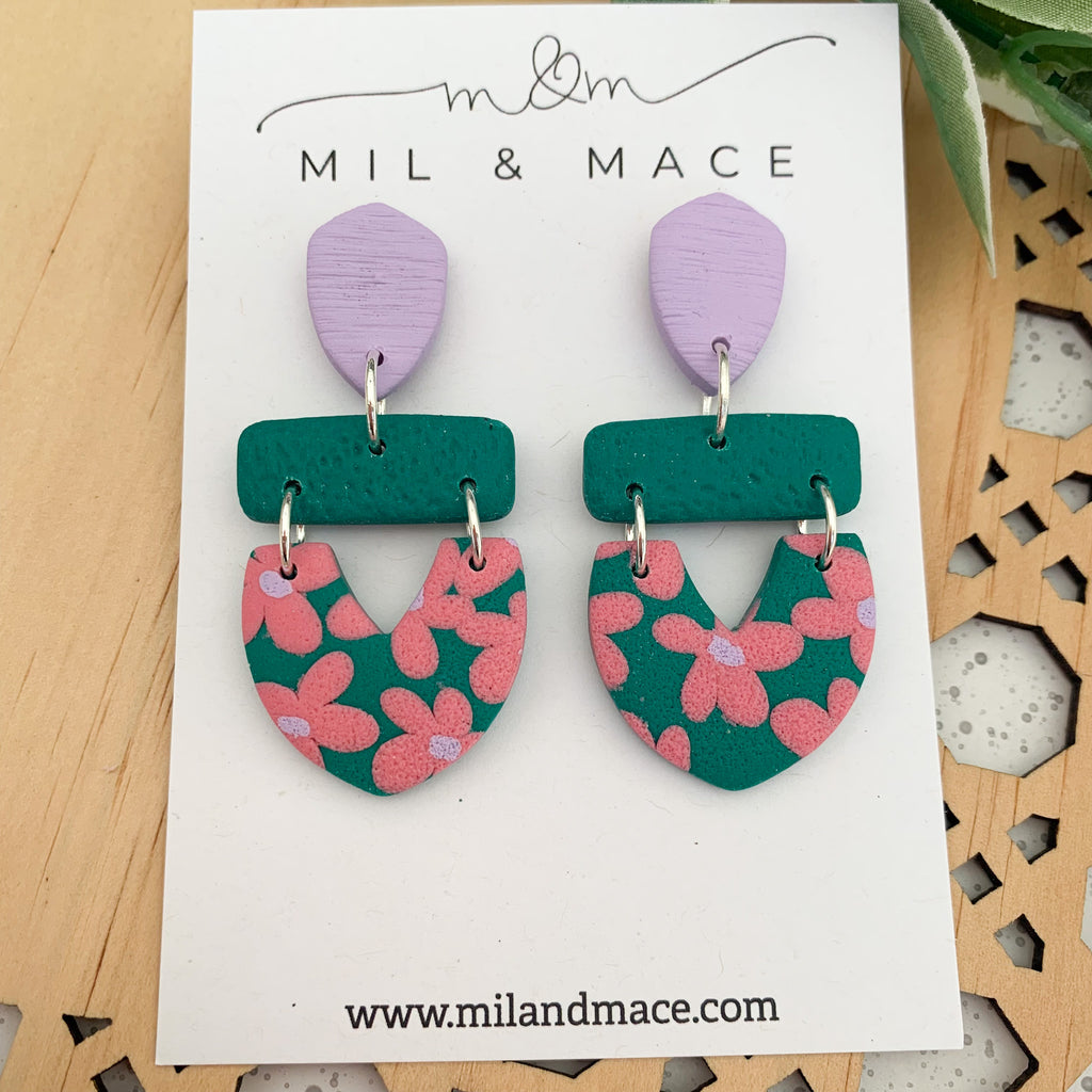 Pink and Green Floral Polymer Clay Dangle Earrings