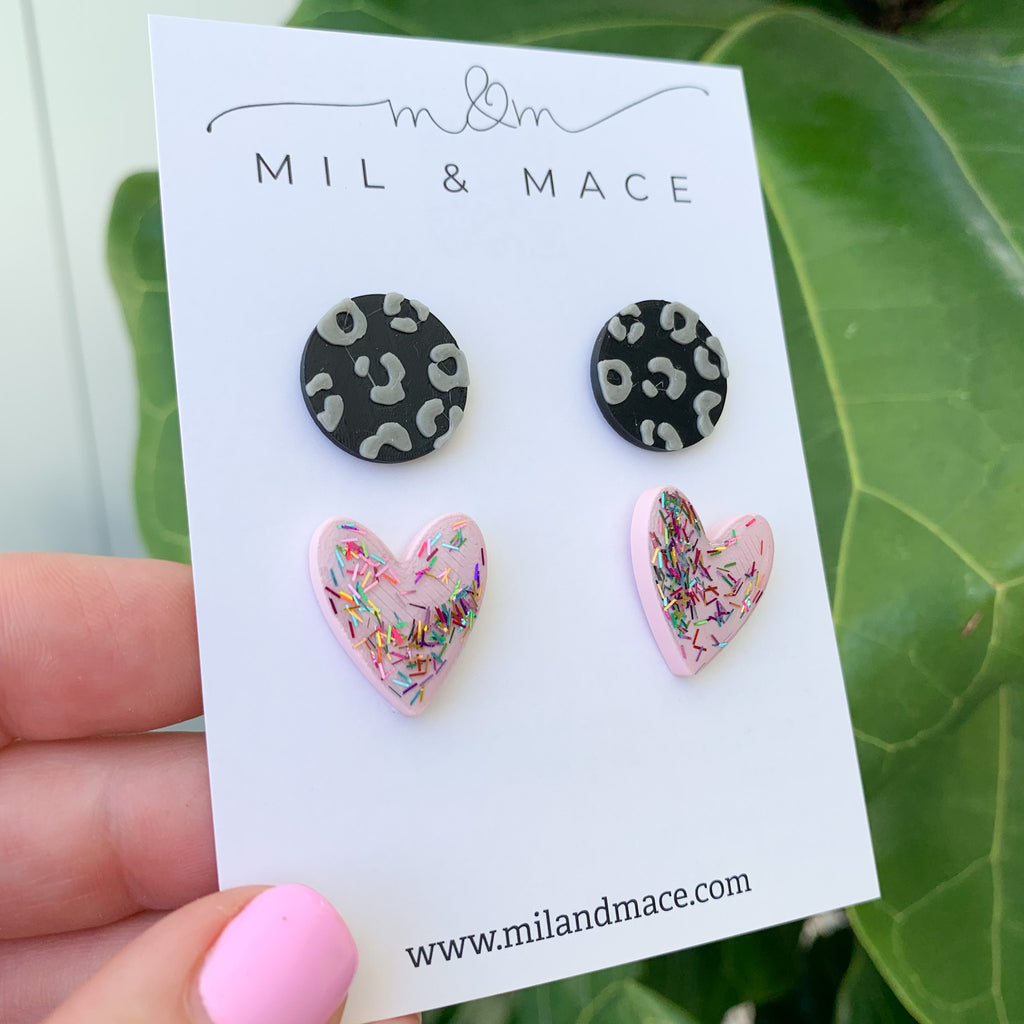 These earrings are made from PLA on the 3d printer and hearts are finished with resin.   Posts are surgical stainless steel making them perfect for sensitive ears and come with butterfly backs.