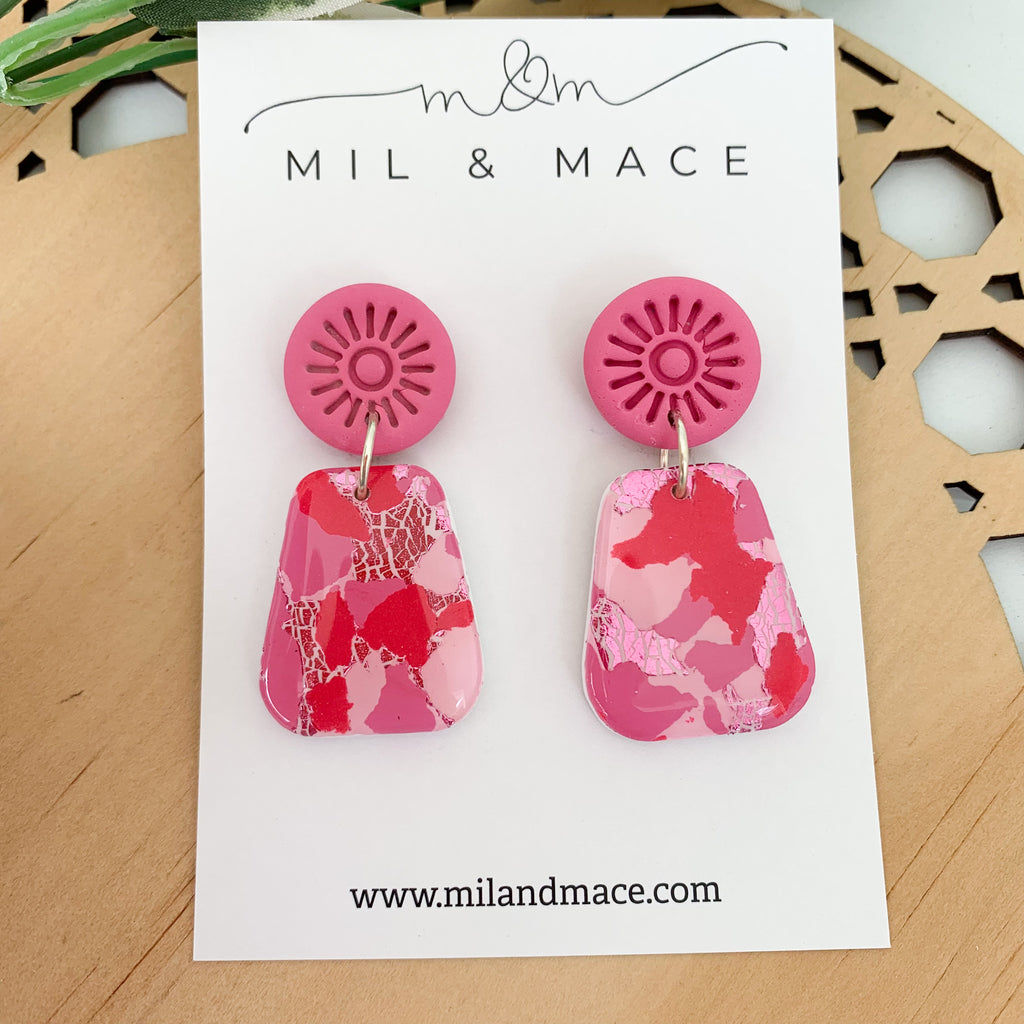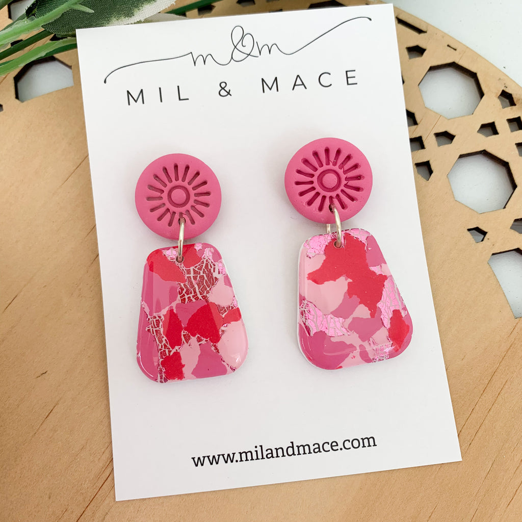 Pink and Red Splash Polymer Clay Dangle Earrings with Resin
