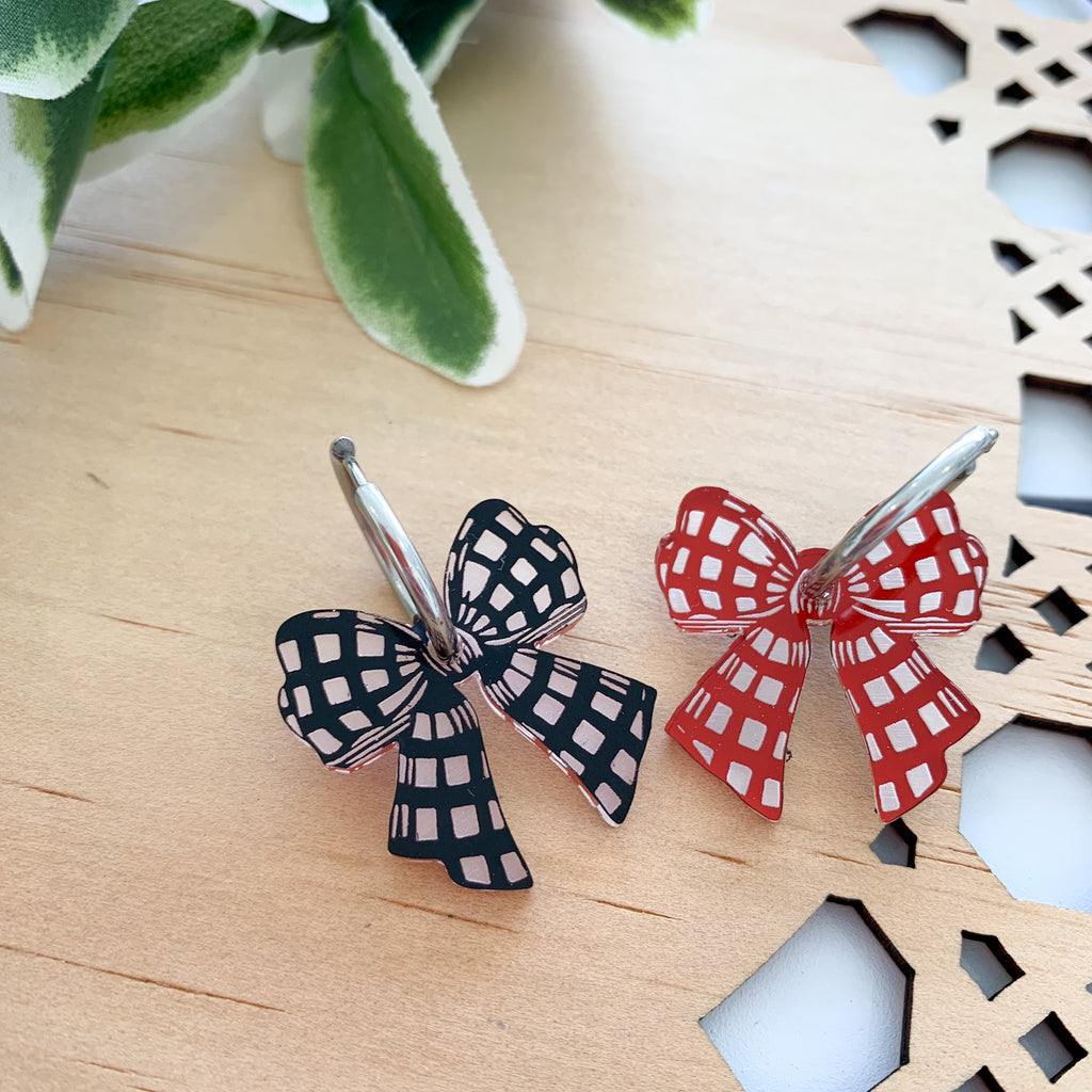 These earrings are made from Acrylic . Hoops are surgical stainless steel making them perfect for sensitive ears. These are reversible with black and white on one side and red and white on the other.