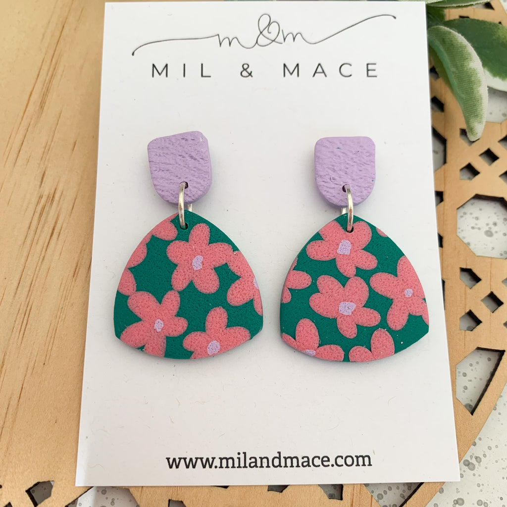 Pink and Green Floral Polymer Clay Dangle Earrings