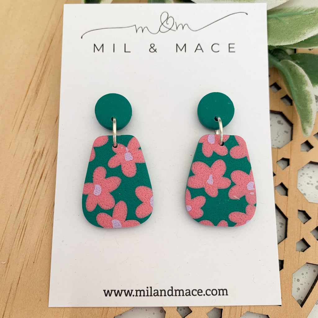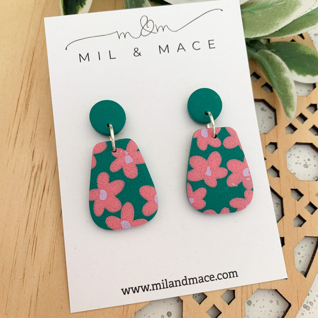 Pink and Green Floral Polymer Clay Dangle Earrings
